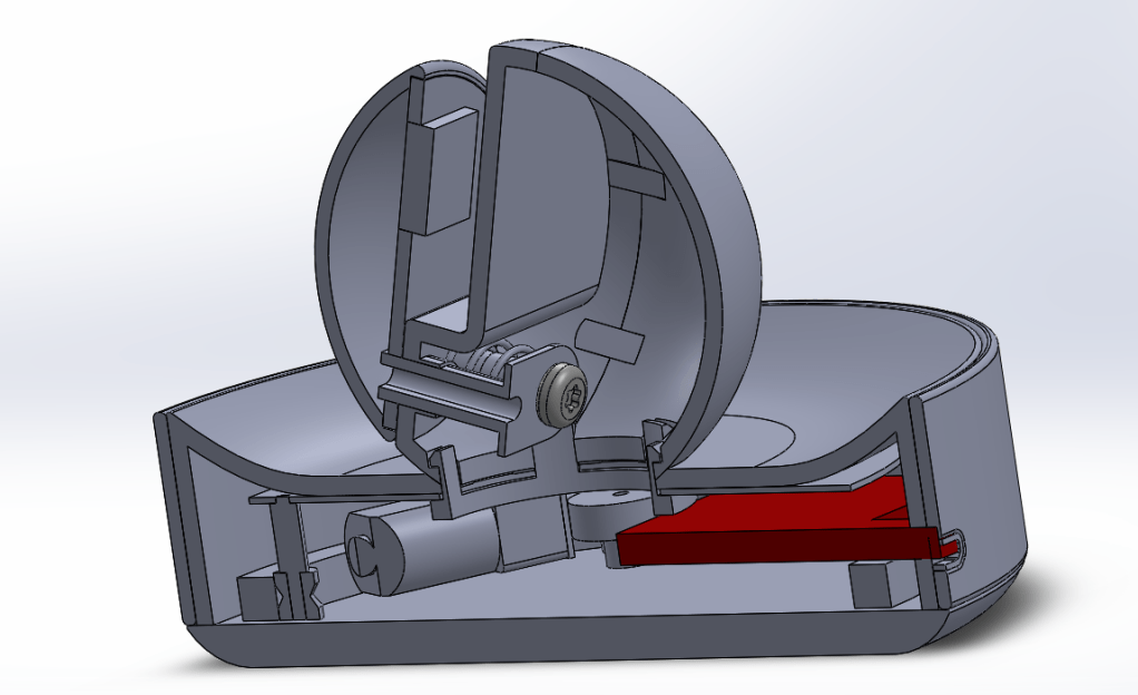 In terms of hardware accessibility, we observed that the mainboard and battery were not secured to the chassis, which could compromise reliability and risk damaging internal electronics. To better secure these components, we fastened all of the electrical components to the device’s chassis to ensure all of the parts had a “home.” We then evaluated the assembly process and decided to use one-way snaps to reduce the device’s number of parts. Secondly, we utilized an electrical portion segregated by sheet metal to protect the PCBs and battery wires from tangling with the gears. The difficulty was creating a custom internal gear ring from scratch that would attach to rollers and allow the unit to move easily and securely.