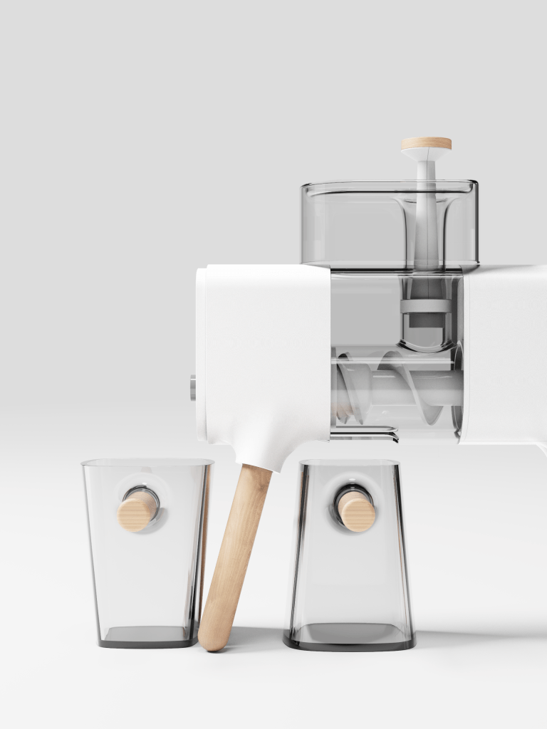 With an increase of single-family households throughout the years, we saw an opportunity to design a new form factor of a masticating juicer. We aimed to take a compact, friendly, and fun approach to this product while using earth-friendly materials. With its wooden legs using authentic and sustainable forested wood, this will allow users to disassemble easily and store the juice when not in use. We also aimed to design the juicer in a way to look great as a home appliance users will want to leave out. It is space-efficient, designed for a modern aesthetic taste, and perfect for contributing to nutritional health and well-being.