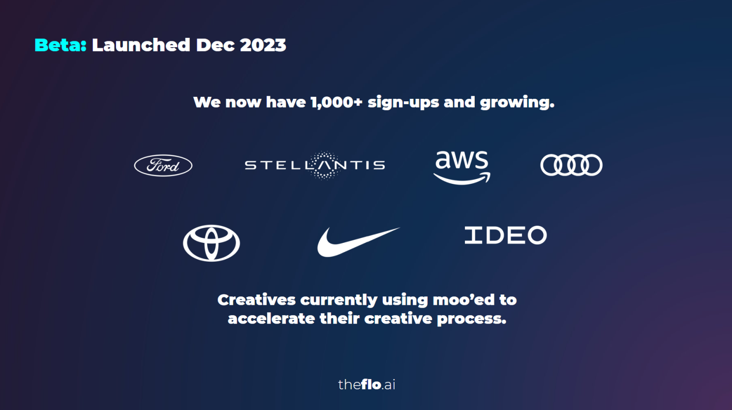 The platform’s rapid adoption, marked by over 1,000 sign-ups shortly after launch(Including the likes of Google, Amazon, Ford, and several notable design firms), reflects the pressing need it addresses within the design community. This achievement underscores the efficacy of FLO.ai in meeting the specific challenges faced by designers and validates our approach to developing a solution rooted in real-world use cases.